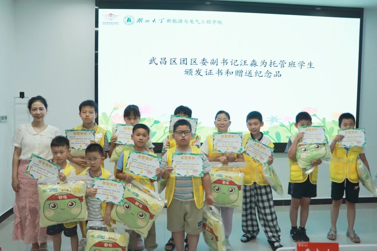 仪式现场暖意融融,一份份礼物传递着深切关怀。徐家棚街道工作人员为志愿者代表送上纪念品,感谢他们用青春力量书写担当;武昌区团委副书记汪淼为孩子们颁发结业证书与礼物,鼓励他们带着这份温暖继续前行。